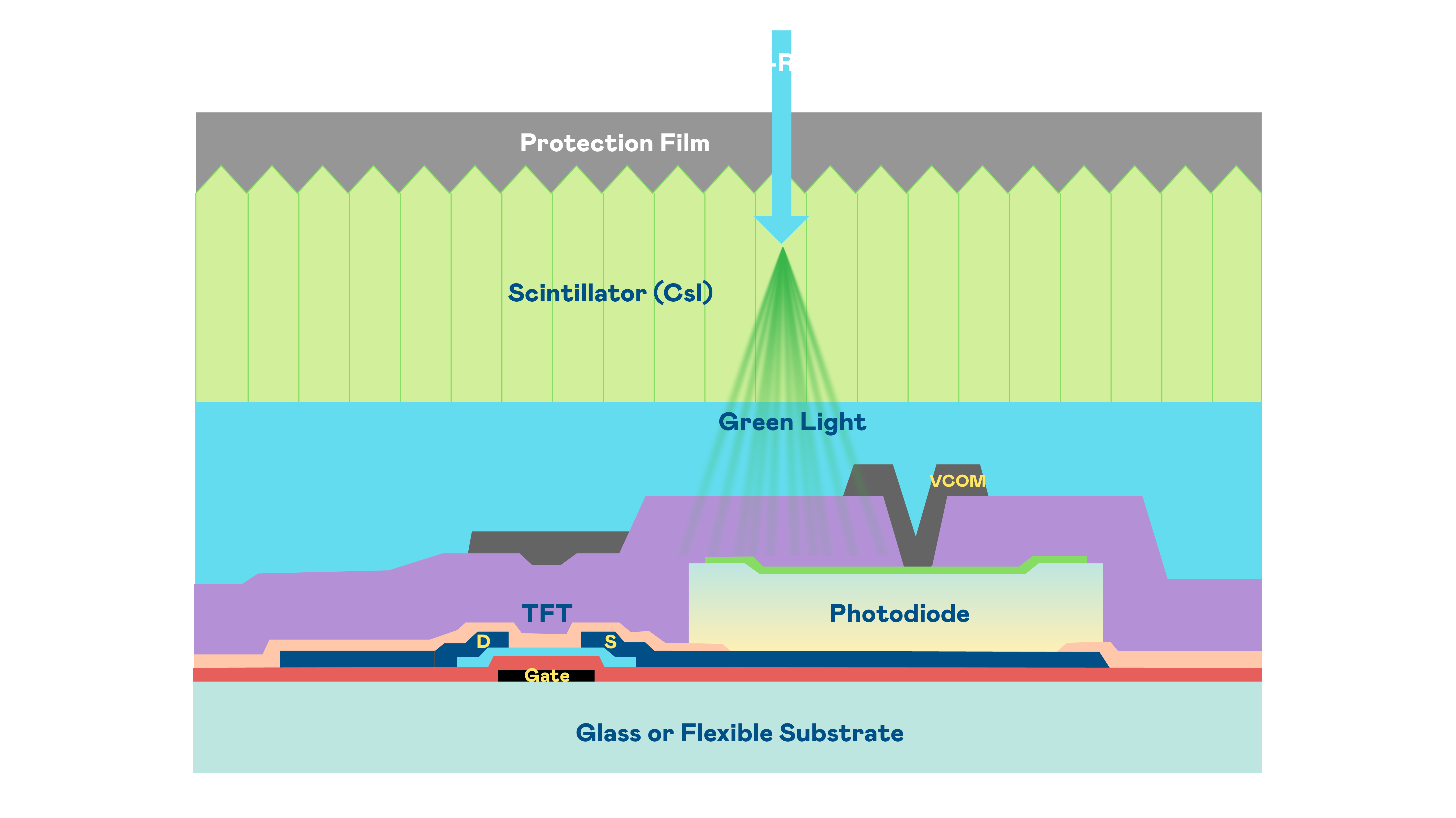 完美真人的X光影像感测阵列使用薄膜电晶体 (TFT) 作为每个像素的读取开关,搭配光电二极体(Photodiode)的光电转换元件,用以感测X光影像讯号。